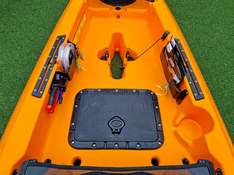 Handy storage pockets for kayaks and boats. Simply mount to any flat surface and you have a great place to keep your tools and tackle organised. Slots ready to hold pliers, scissors, fish grips and more. A larger top slot allows you to hold a small tackle box, spools of leader line, a phone and other items you may need to easily access. Slots feature along the top edge - perfect for hanging lures and hooks from.