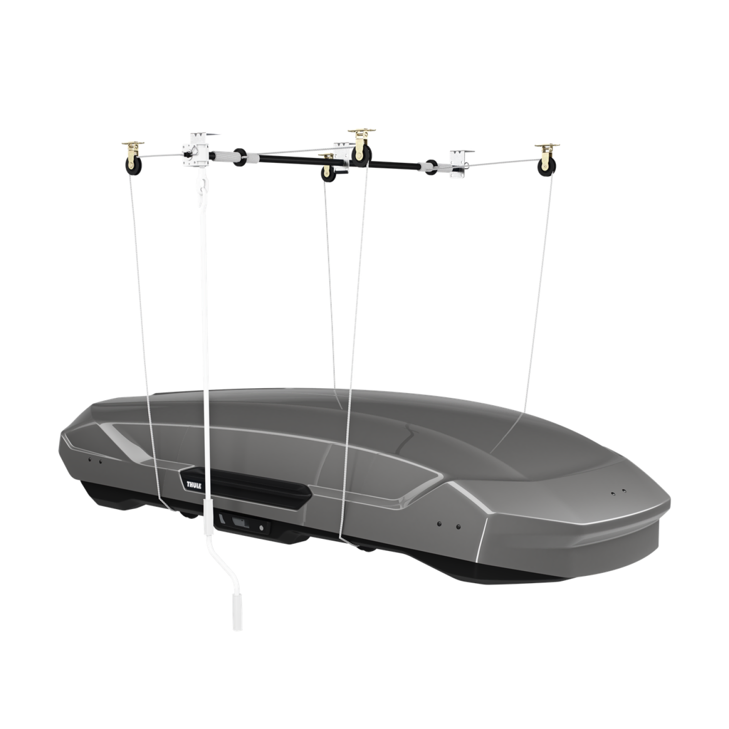 The Thule MultiLift 572 is a ceiling mounted storage system designed to assist with loading and unloading roof boxes, kayaks, SUPs, sit on tops etc. The system attaches securely to your garage ceiling and employs a pulley system to raise and lower items so taking the strain out of loading!