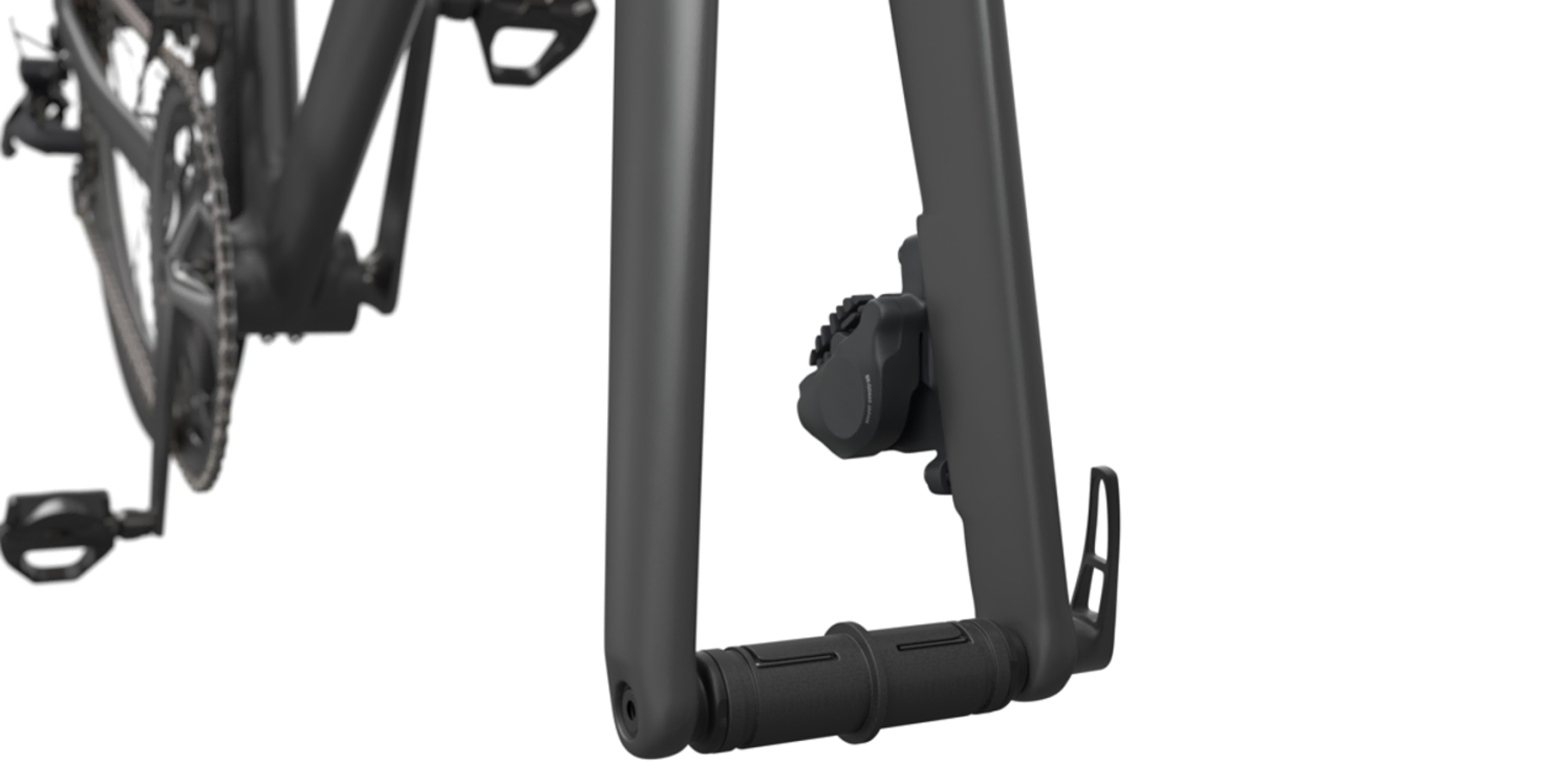 - The bike slides into the carrier on a guided track on the fork adapter and clicks into place