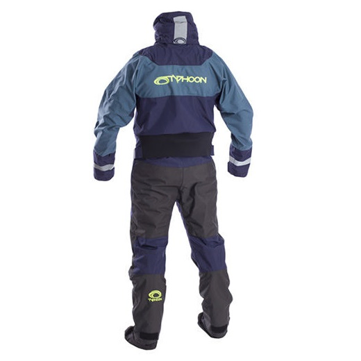 Putting on and taking off the suit is made easy with the Aquaseal hinge waist zip - simply step-in, put on the integrated shoulder braces and then do up the waist zip. High-Viz decals and reflective elements adorn the neutral blue and grey colour theme. The suit features easy access chest pockets positioned to work even when wearing a buoyancy aid. When the weather is really against you, the suit has a fleece-lined storm collar and a volume-adjustable hood to keep the elements at bay.
