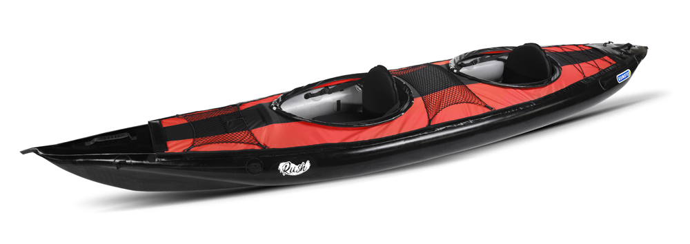 The Gumotex Rush 2 uses the latest drop stitch technology to achieve hydrodynamic lines and a higher pressure hull for more efficient paddling. The Rush 2 is a versatile tandem inflatable kayak with an open cockpit design, for which you can purchase an optional cockpit cover should you wish to have the option of choosing a closed cockpit for rougher water or poor weather paddling. The main advantages of the drop stitch hydrodynamic construction are speed and stability, along with better edging control. The Rush 2 is suitable for gentle recreational paddling on calm lakes or rivers, as well as cruising along the seashore in light winds. It is also a good choice for running white water rivers up to grade 2. There is also an optional rudder assembly, which will improve performance on open water in windy or choppy conditions.