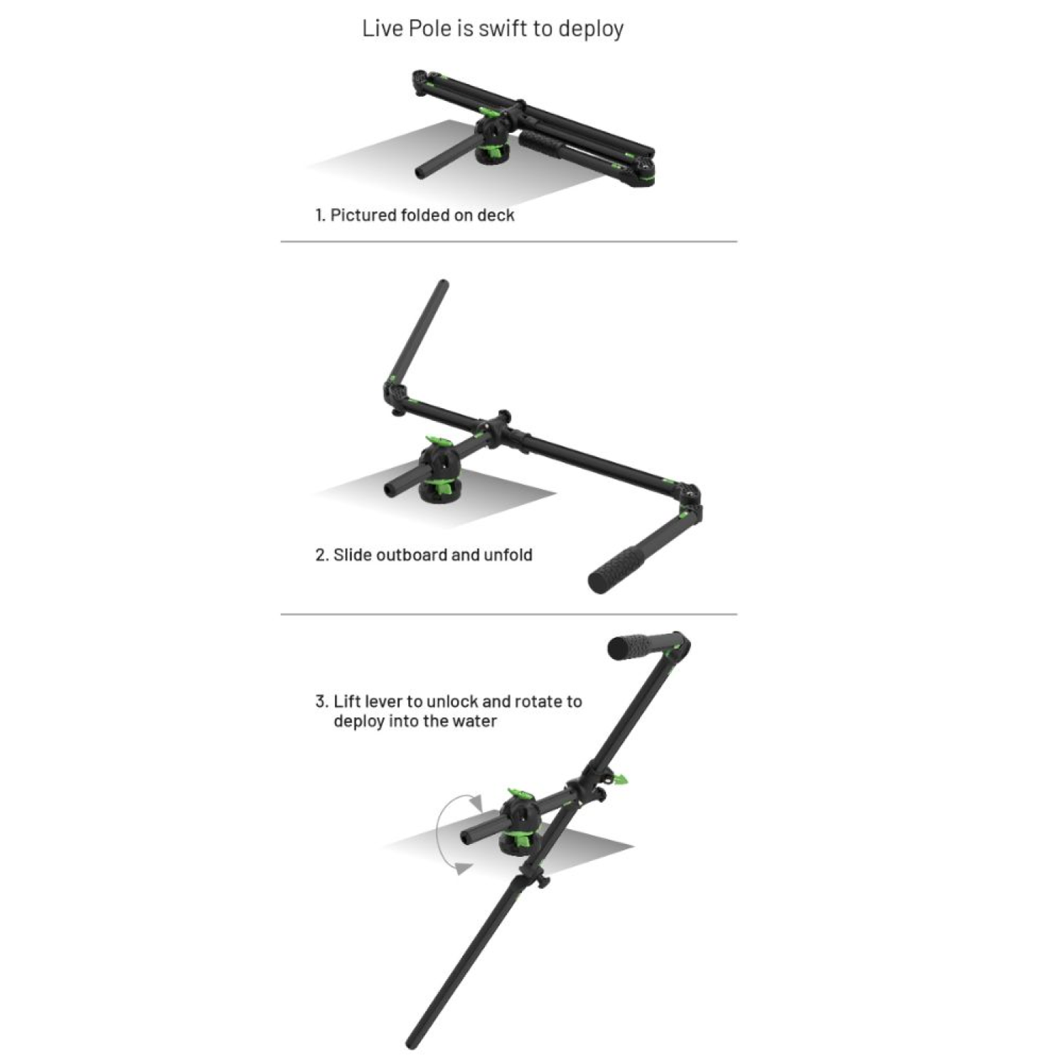 The ultimate way to mount your live sonar transducer on a kayak, canoe and small watercraft with low freeboard. Designed to fit onto the deck, track or rail systems for easy installation. This handy pole is quick and easy to deploy allowing you to aim your live sonar with pin-point accuracy to underwater targets and features. The LivePole allows for easy 360 degrees rotation and there is direction indicator fitted to the pole so you know exactly where your transducer is pointing. When you spot a fish you can cast straight to it! It is easy to adjust the depth setting and control tilt of the arm too.