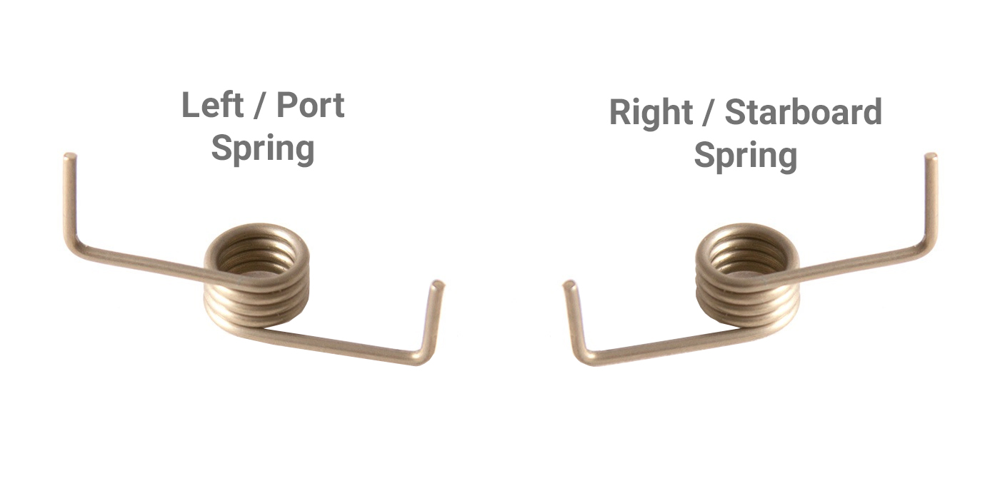 Replacement springs for the Click-N-Go Mirage Drive Ports found on many roto-moulded Hobie Kayak models from 2009. Sometimes the springs can bend or snap with fatigue. Replacement left / port and right / starboard side springs are available. To replace these, you need to remove the black plastic cover on the drive latch using a small precision screwdriver.