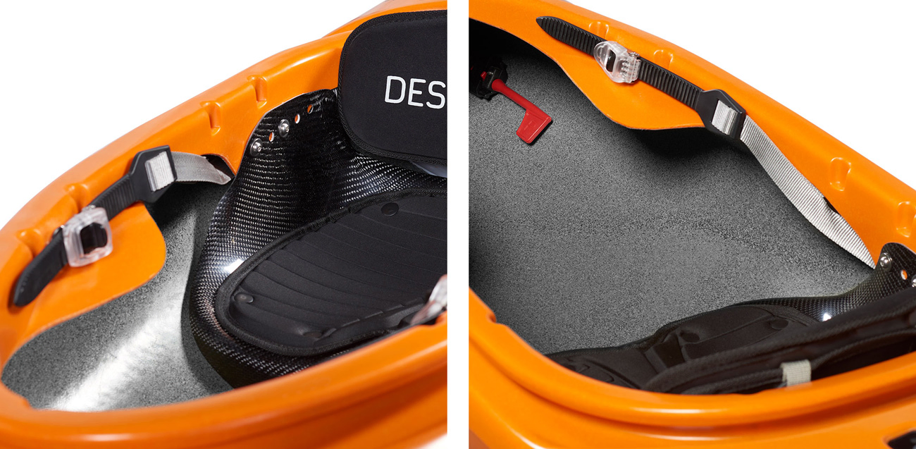 The flattened bottom of the hull under the cockpit gives the Design Kayaks Awesome plenty of stability and provides a great surface for riding surf or catching wave trains on downwind runs. The distinctive soft-chined shoulders respond well to edging and combined with the low stern deck Awesome is a dream to roll. Carefully designed cutaways either side of the foredeck enable those high angle power strokes without catching the side of the hull with your paddle. The skeg slider is absolutely flush with the hull and placed well out of the way of paddle strokes yet within easy reach. Just a little pressure on the button and the sprung design lets the skeg down effortlessly. The Awesome has a lightweight carbon seat and a backrest that is easily adjusted via a unique ratchet system so you can get just the right tension. The thigh braces are made extra wide providing excellent connectivity at all times.