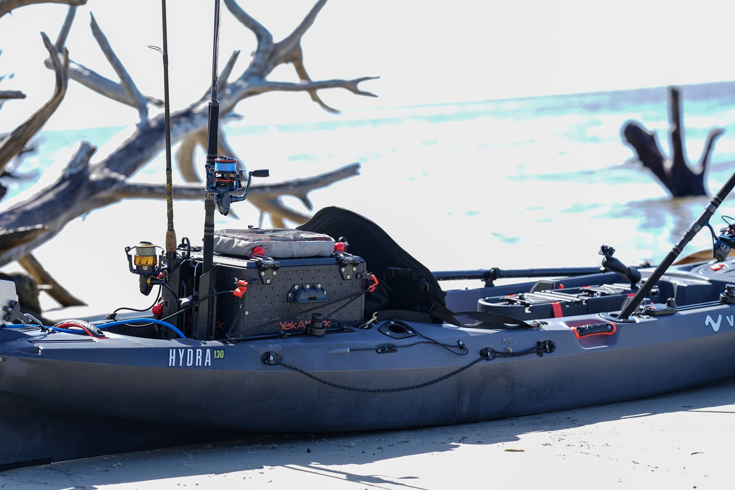 At 13ft long with a 29in beam and a classic tri-form hull design, the Hydra 130 really hits the sweet spot in offering excellent speed through the water whilst still offering good primary and secondary stability for great performance in choppy coastal waters. The flared bow with aggressive rocker charges up over choppy waters and swells and helps you maintain speed as you paddle along. Combined with the low centre-of-gravity contoured seating position and comfortable clip-in backrest, you have a fishing kayak that is quick through the water and will take you the distance on your next saltwater fishing adventure! The Hydra 130 comes outfitted with the Vibe Gravity Rudder for enhanced performance in cross winds and dynamic tidal waters, with steering controlled by the sliding freeflow footrests. The Gravity Rudder is also 'Bixpy-Ready' making it super easy to motorise your Hydra with a lightweight electric Bixpy K-1 Motor Kit, for those who want to really take their kayak fishing game to the next level!